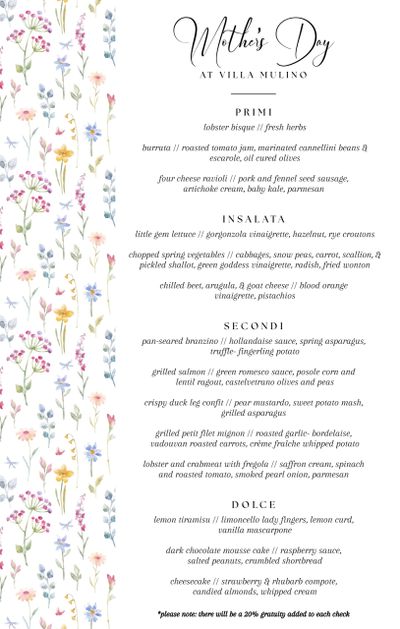 Join us this Mother’s Day for a beautifully curated dining experience at Villa Mulino. We will be offering a special prix-fixe menu for $78 per person, along with a kid’s prix-fixe option for $38, thoughtfully designed for the occasion. Please note that a 20% gratuity will be added to each check. Celebrate the day by treating mom to an experience filled with exceptional food, warm hospitality, and memorable moments. Please call the restaurant or book online to secure your table.